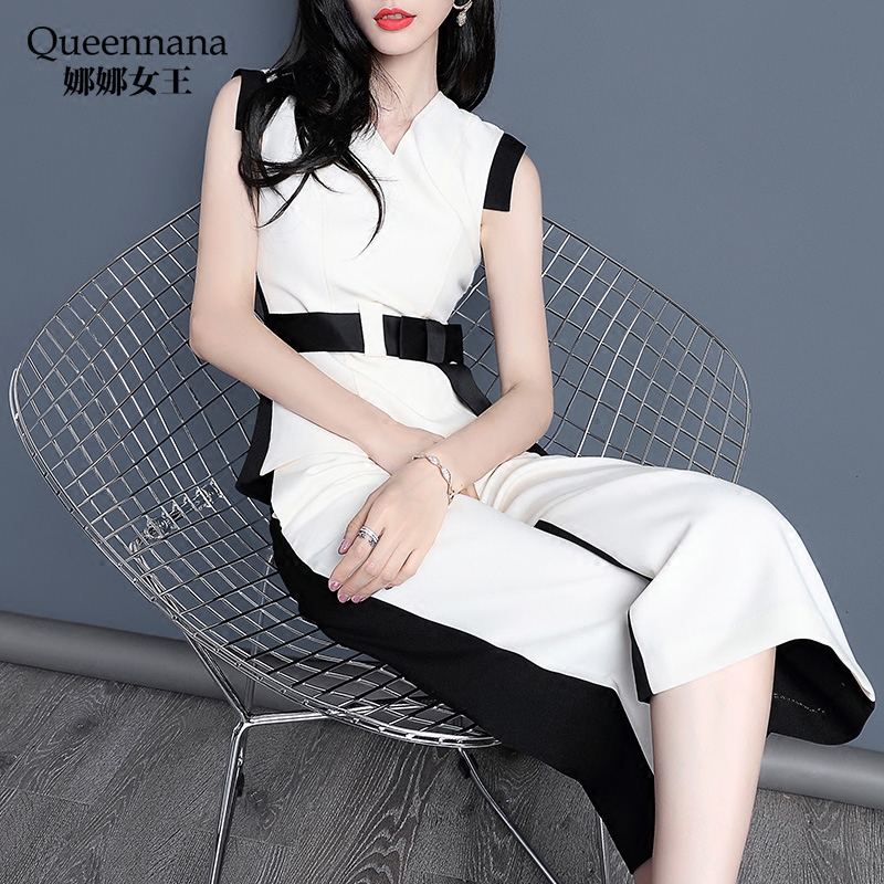 新款經典黑白撞色搭配無袖上衣闊腿褲