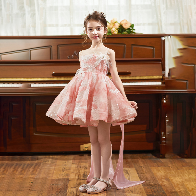 禮服裙主持人兒童生日宴會花童連衣裙小香風走秀拖尾 女童粉色短款