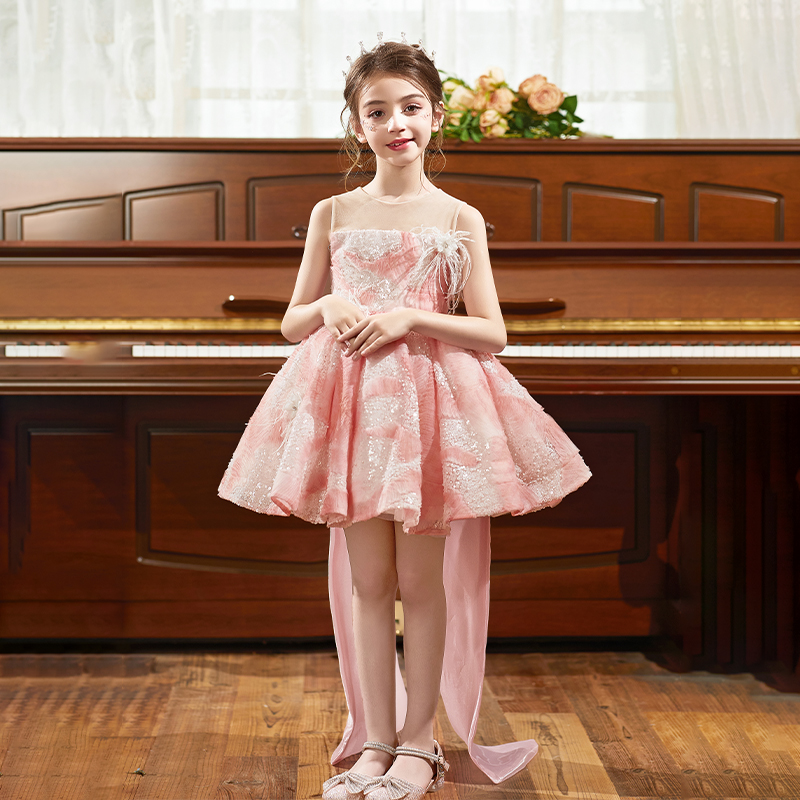 禮服裙主持人兒童生日宴會花童連衣裙小香風走秀拖尾 女童粉色短款由